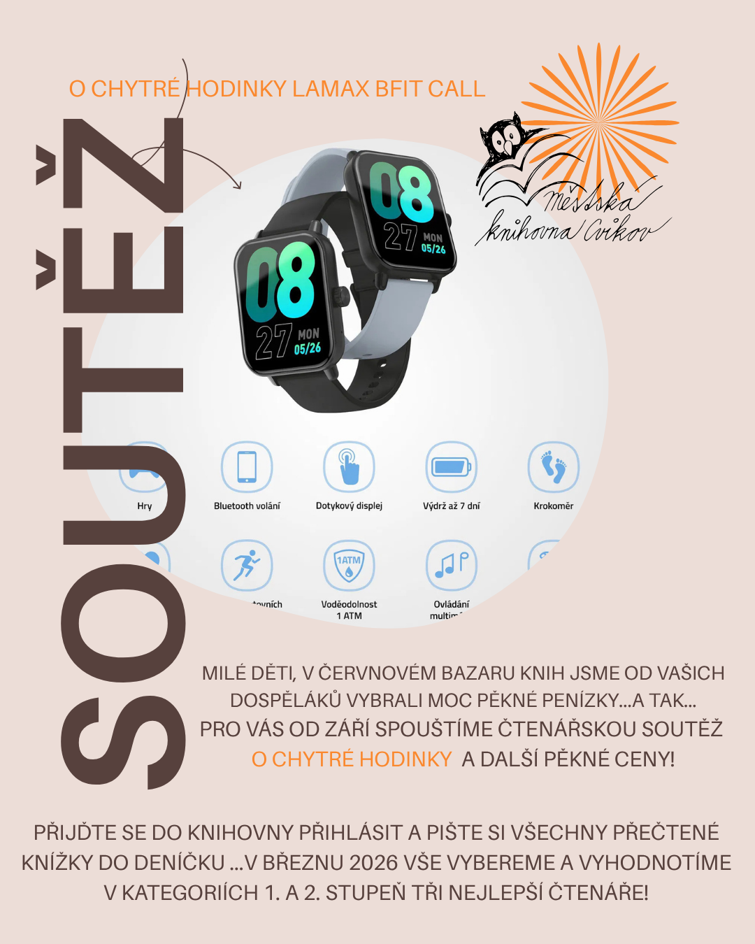 Od září tedy spouštíme Velkou čtenářskou soutěž o chytré hodinky a další pěkné ceny! Děti se můžou přijít přihlásit do knihovny, dostanou čtenářské deníčky a můžou začít vyplňovat informace o přečtených knížkách. V březnu 2026 vše vybereme a vyhodnotíme v kategorii 1. a 2. stupeň ZŠ tři nejlepší čtenáře!