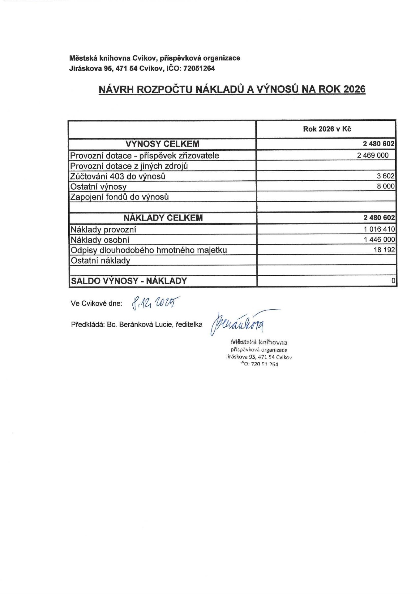 Návrh rozpočtu nákladů a výnosů na rok 2026